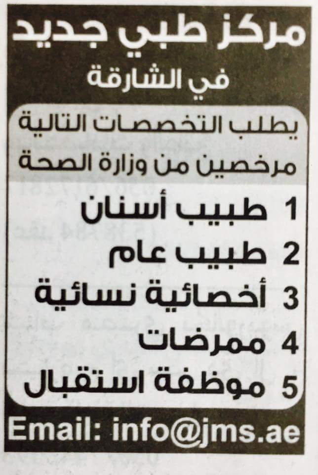 اعلن مركز طبي حديث بالشارقة الامارات العربية المتحدة عن وظائف شاغره