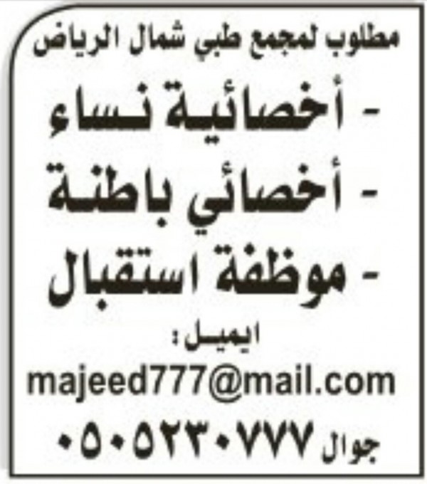 وظائف طبية شاغرة في مجمع طبي شمال الرياض بالسعودية